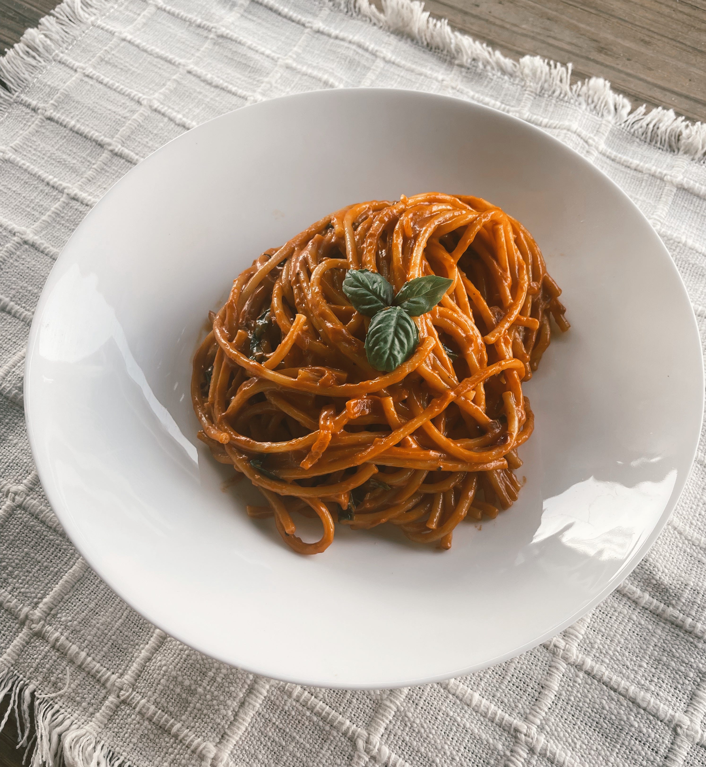 My favorite food in the world is vodka pasta, so I have worked for years to perfect my own recipe. And now, because I love you guys, I’m going to share it here. It’s so easy and so so delicious. Start by putting a heaping teaspoon of minced garlic, four tablespoons of butter, and an entire diced sweet onion in the pan. Cook the onions until they're browned. Then dump a heaping teaspoon of red pepper flakes and almost one whole can of tomato paste into the pan. Stir it all around and reduce with a cup of red wine or vodka. I usually use red wine bc I never have vodka in the house. Let that bubble and combine for a few minutes, then add a cup of shredded parmesan and a cup of heavy cream. Let it bubble a few more minutes, dump in a whole container of bucatini, and voila! You’re done! I like to add some basil at the end too.
